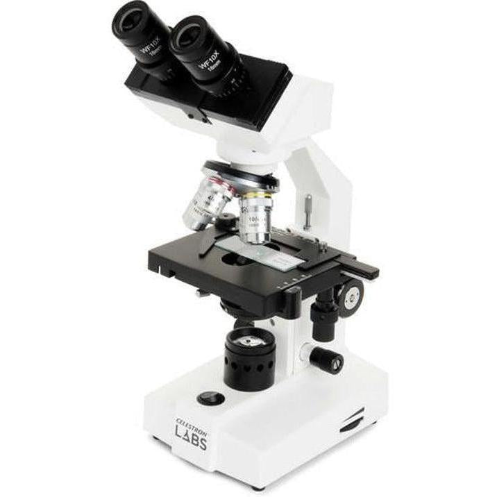 Celestron Lab's CB2000CF Compound Binocular Microscopeis ideally suited for students and hobbyists with its comfortable binocular head design and broad magnification range. Its four-objective click-stop turret holds the 4x, 10x, 40x, 100x achromatic objectives and the instrument comes with two sets of eyepieces that produce magnifications from a practical 40x to a powerful 2000x.