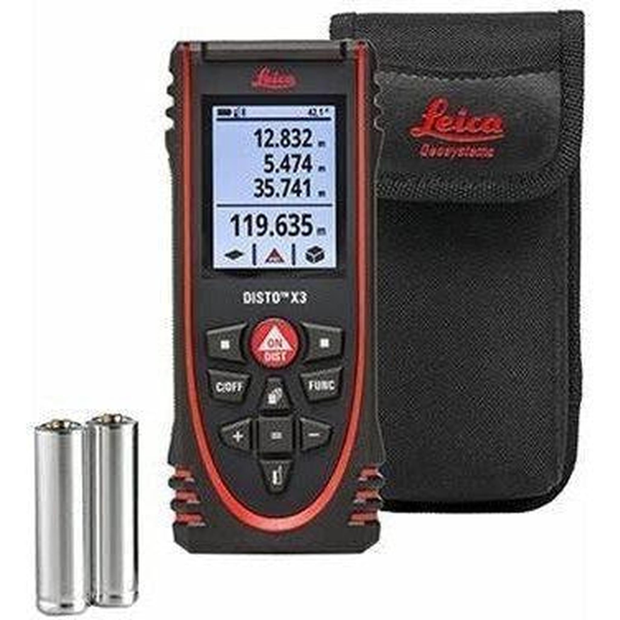 The Leica DISTO X3 is designed to make indoor laser measurements an easy task. A holster, hand loop and batteries are included. The Leica DISTO X3 is perfect for tough construction site conditions. It is drop-tested up to 2 m in height, water jet and dust protected to IP 65 standards.
