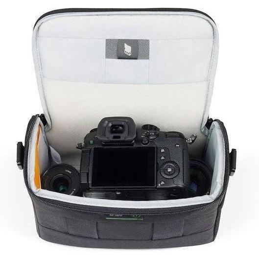 Made of 84% recycled and solution-dyed fabrics Fits full-frame mirrorless with lens with 2 additional lenses Adjustable/detachable shoulder strap and integrated belt loop Durable PVC-free custom-molded base protects gear from impact Features interior memory card pocket and expandable side pocket
