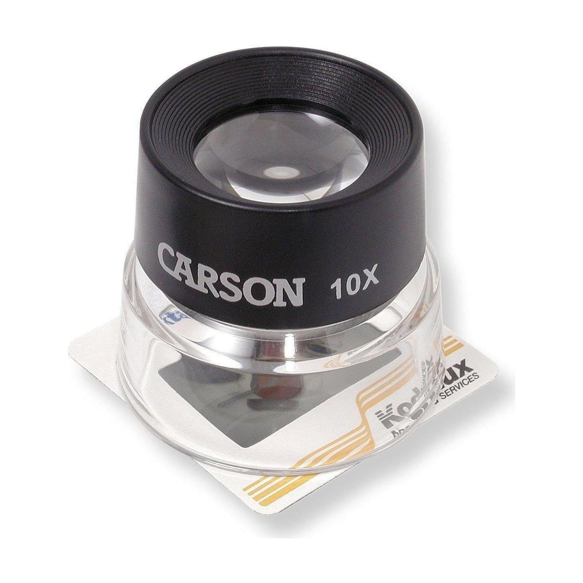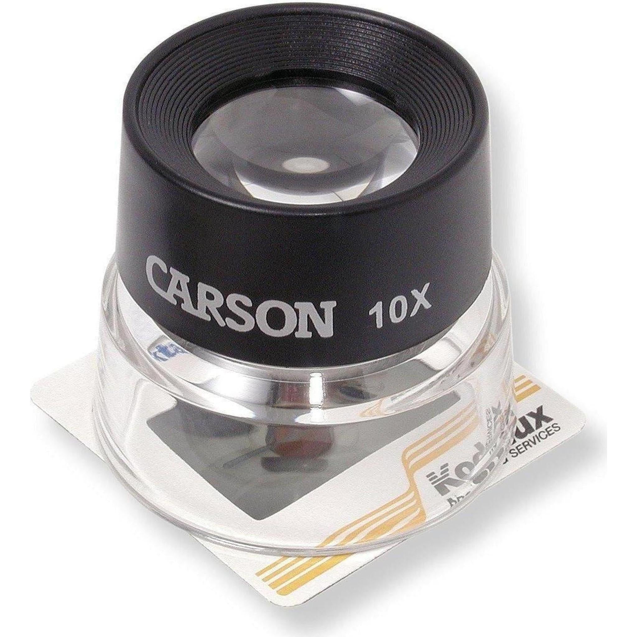 The LL-10 LumiLoupe from Carson Optical is a 10x power stand Magnifier that makes the ordinary extraordinary. This Magnifier reveals details you've never seen before in things you look at every day. Pre-focused dual lenses allow examination of objects close-up, while a transparent acrylic base permits ambient light to illuminate the subject for bright, clear viewing. Choose the LL-10 (10x power) Magnifier for fine details, coins, stamps, photography and miniatures.