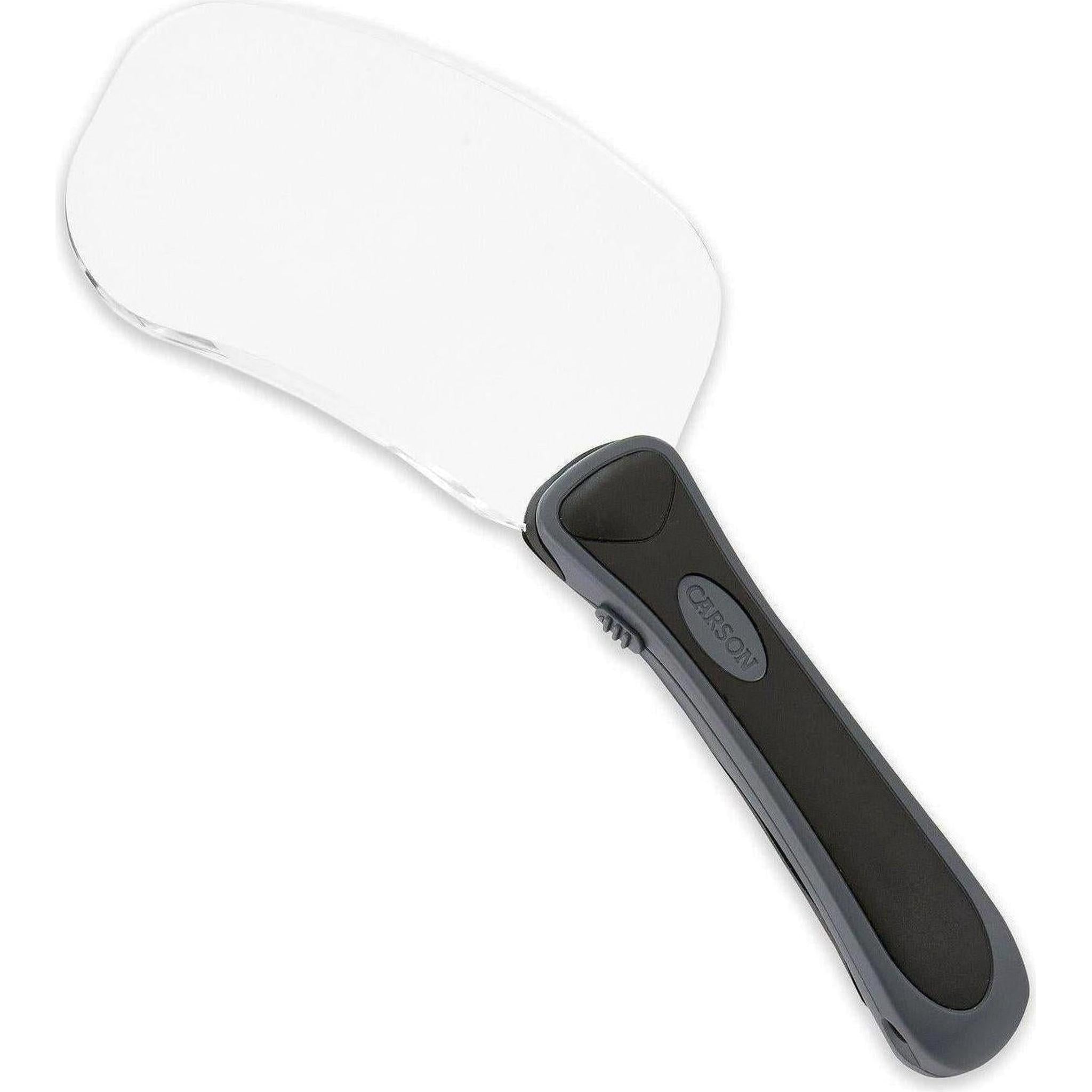 Carsons RM-77 hand held magnifier is designed with comfort in mind. Its ergonomic, soft-grip handle promotes a natural hand position while featuring a 4.7 x 2.7 acrylic crystal clear, rimless, magnifying lens. Enjoy a wide, distortion-free viewing area easing eye strain over extended periods of reading. A side mount switch allows you to easily turn on the built in LED for low-light illumination. The wide lens and unique rectangular shape of this magnifier were designed specifically for line by line reading of books, recipes, or your favorite periodicals. The magnifier packs a wide range of features in to its lightweight, well-balanced design. Great for general use or for those in need of a magnifying lens thats as easy on the hand as it is on the eye.