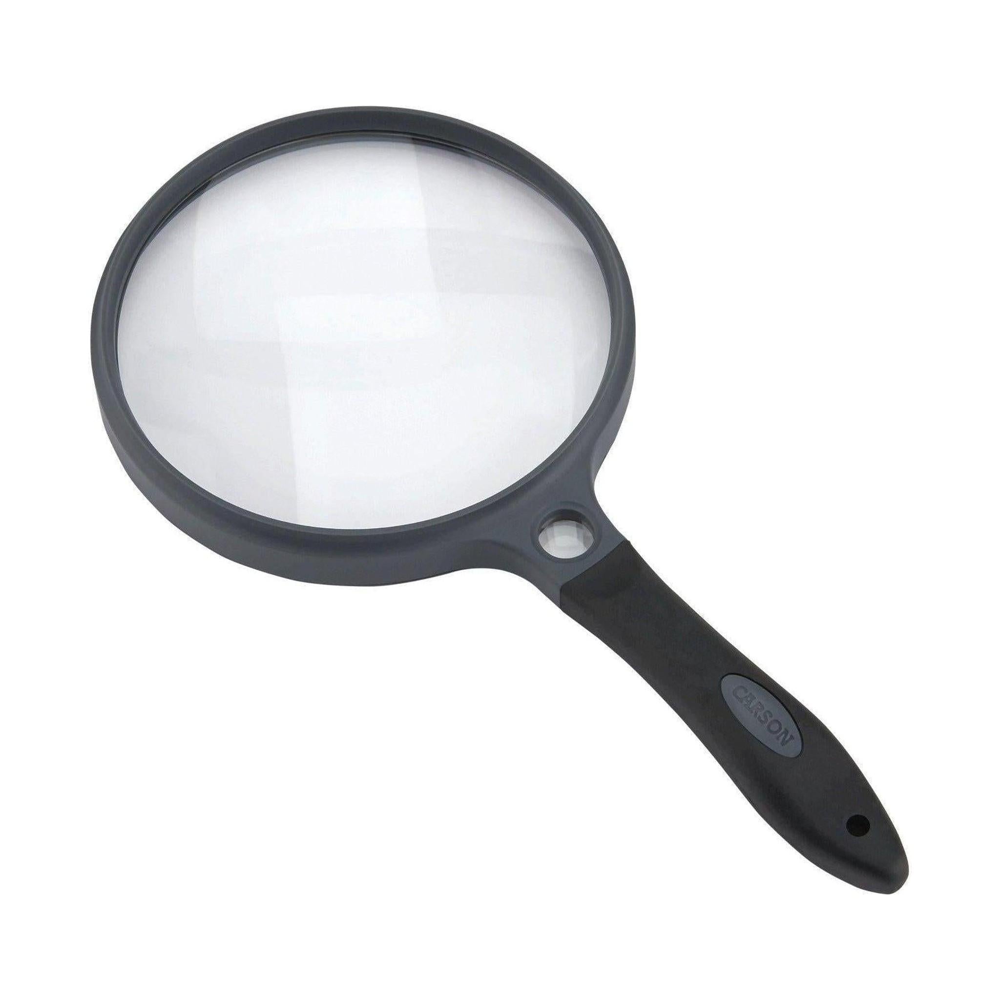 If durability is what you need, the Carson SureGrip magnifying glass is what youre looking for. Reasonably priced, it is equipped with a 2x magnifier with 11.5x, high power spot lens for close up inspection. The 90mm (3.5) glass magnifier is the perfect solution for those searching for a durable lens that will not scratch. The 11.5x spot lens is integrated in to the SureGrip rubberised handle and made of crystal clear glass. Soft-padded, zippered case included.
