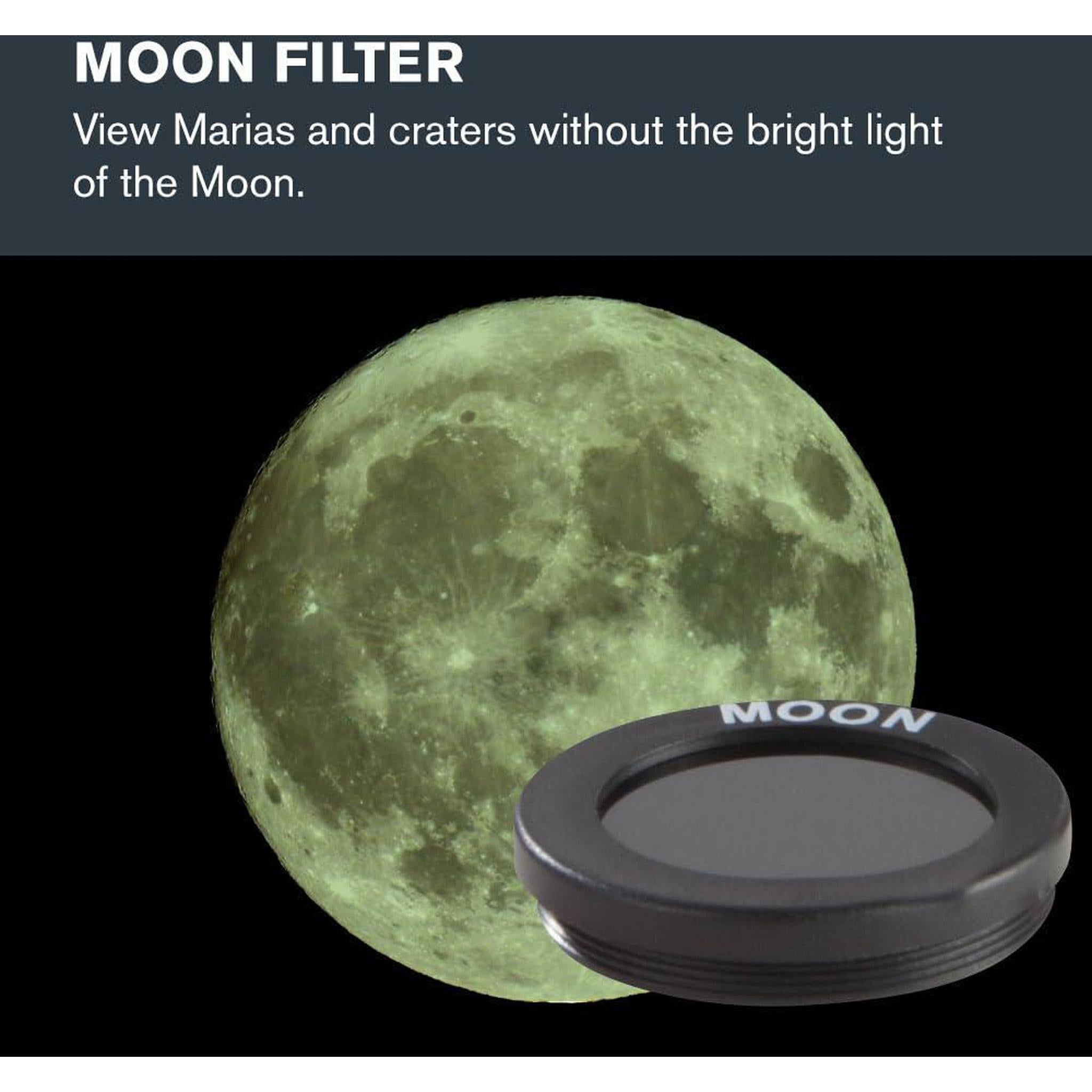 • A Moon filter helps block out some moonlight so you can see more lunar detail, and the two color filters (Red and Blue) highlight features on Mars, Jupiter, and Saturn