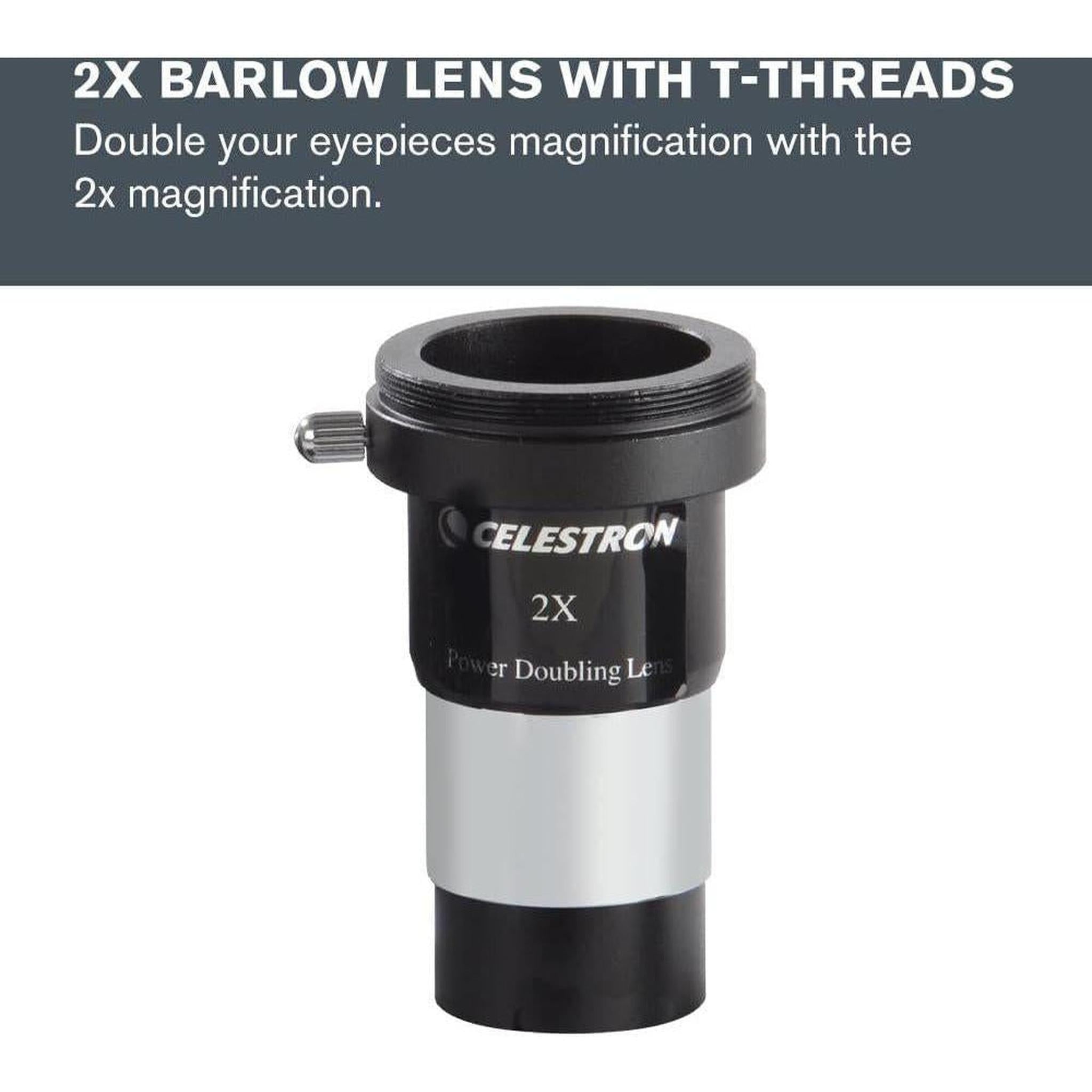 2x Barlow Lens - Insert the 2x Barlow Lens between the eyepiece and the telescope and it doubles the magnification of any 1.25” eyepiece. That means the 15mm Kellner included in this kit will double in power, effectively becoming a 7.5mm eyepiece, and the 6mm will provide the magnification of a 3mm. Any other 1.25” eyepieces you already have will also work in this versatile accessory, giving you even more magnification choices. Remember, high magnifications do not always produce clear, sharp results, especially on evenings of poor or moderate seeing conditions. Experiment to find the magnifications that are best for you and your telescope. T-Threads are machined into this Barlow lens, allowing a user to attach a DSLR camera with the addition of an optional T-Ring.