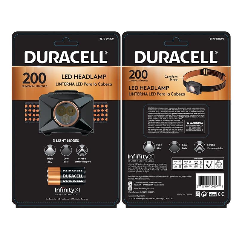 Handsfree work has never been easier, thanks to the Duracell 200 Lumen LED Headlamp. It is fitted with a head strap that brings you unmatched comfort, which means your hands are free to do, well, whatever they want. FEATURES IPX4 water resistance to withstand even the most extreme weather conditions. The adjustable and ultra-comfortable head strap allows you to fit it perfectly to your head for unmatched comfort and support while keeping your hands free to focus on the task at hand. 3 light modes: Switch between High (200 lumens), Low (30 lumens), and Strobe. Powered by 3 AAA batteries (included). Indoor and outdoor use: Take with you for outdoor activities such as camping and hiking or use at home for blackouts and everyday tasks. Vivid illumination. Powerful and incredibly bright 200 Lumen LED Lantern with IPX4 water resistance to withstand even the most extreme weather conditions. Designed with you in mind. The ultra-compact design and the adjustable and ultra-comfortable head strap allow you to fit it perfectly to your head and to use hands-free so you can focus on the task at hand. 3 light modes. Switch between High (200 lumens), Low (30 lumens), and Strobe. Batteries included. Powered by 3-AAA Duracell Batteries.