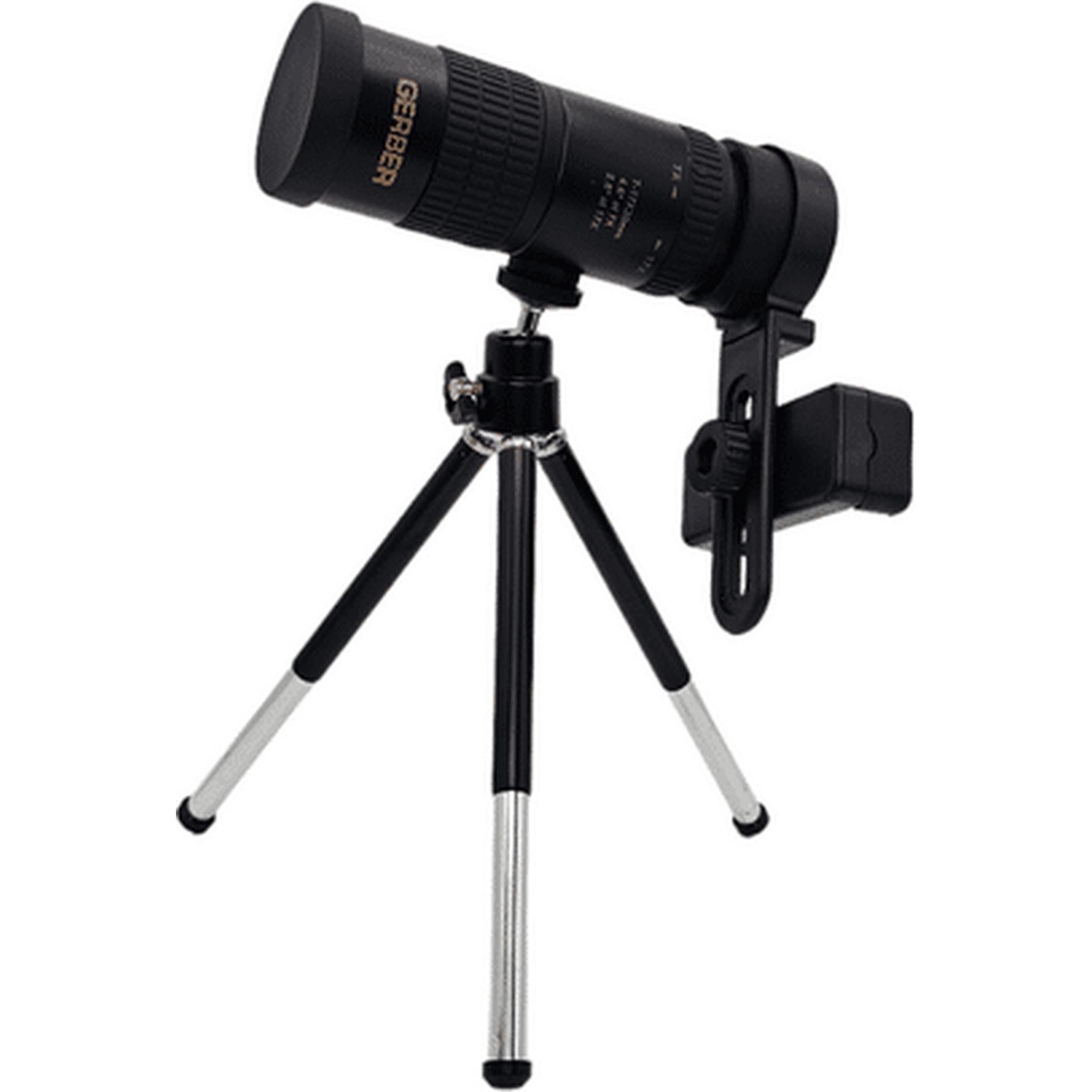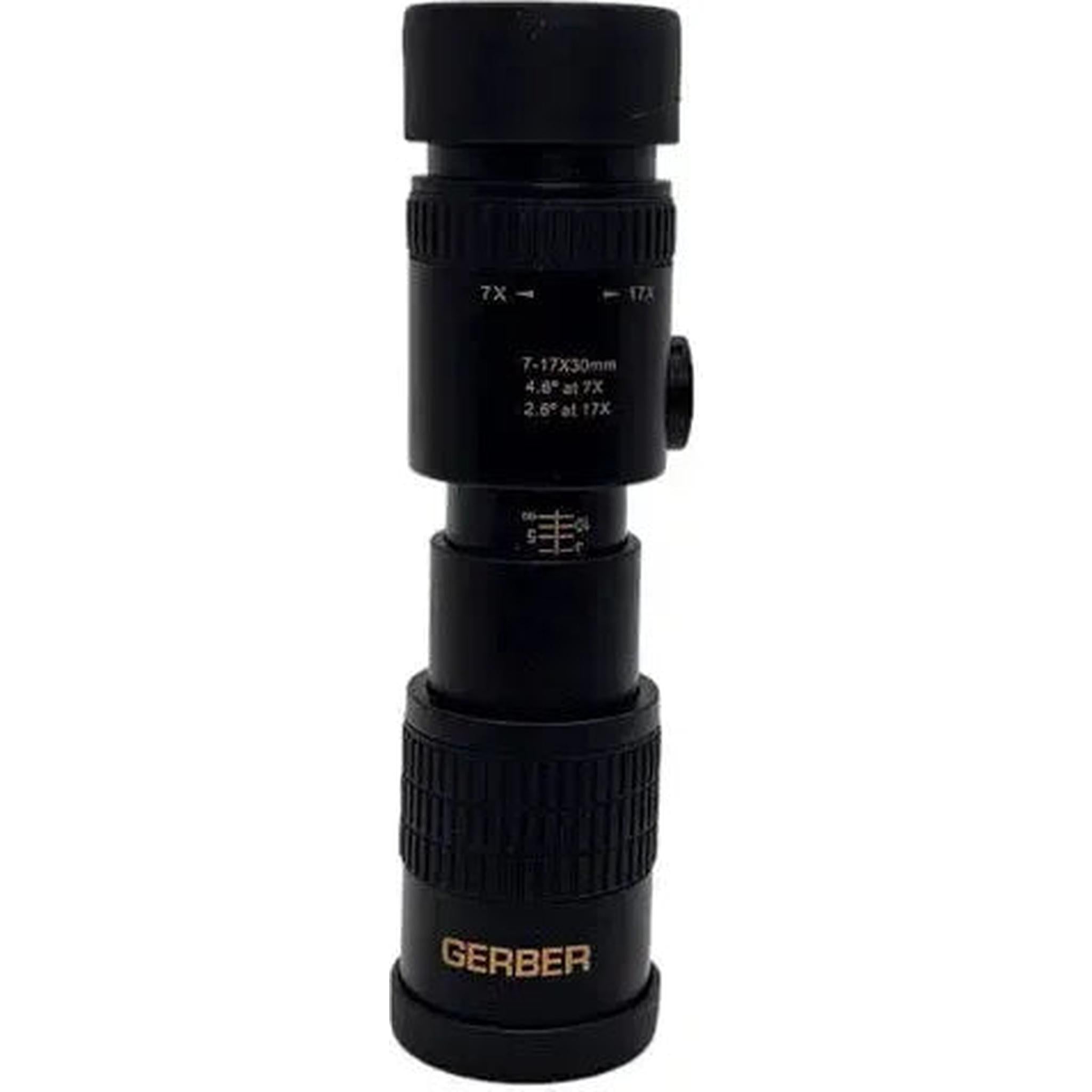 The GERBER Zoom Monucular is extremely versatile, providing an 7x - 17x zoom magnification with a 30mm objective diameter. They feature a handy dual focusing system with quick focus and fine focus option to get you eye on your target in record time. Multi-Coated optics give you crisp clear images, always. The GERBER Zoom Monocular 7-17x30 includes a smartphone adapter and handy ball head mini tripod to take amazing images. They are supplied with a soft case, wrist strap (attached at tripod mount), eye piece covers, smartphone adapter and mini ball head tripod, all in a stylish coloured package Type: Zoom Magnification/Diameter: 7x-17x30 Focusing: from 1.6m Field of View: Angle: 5.3° (7x) - 2.9° (17x) at 1000m: 93m (7x) - 51m (17x) at 1000yd.: 279ft. (7x) - 153ft. (17x) Exit Pupil: 4.2mm (7x) - 1.7mm (17x) Weight: 160g Tripod Adaptability: Yes Gerber Monoculars are made with an uncompromising commitment to quality. Their superior components ensure the ultimate viewing experience for every user. Featuring a wide assortment of models with distinctive specifications. Gerber monoculars have become the favourite choice of avid hunters, birdwatches and boating enthusiasts.