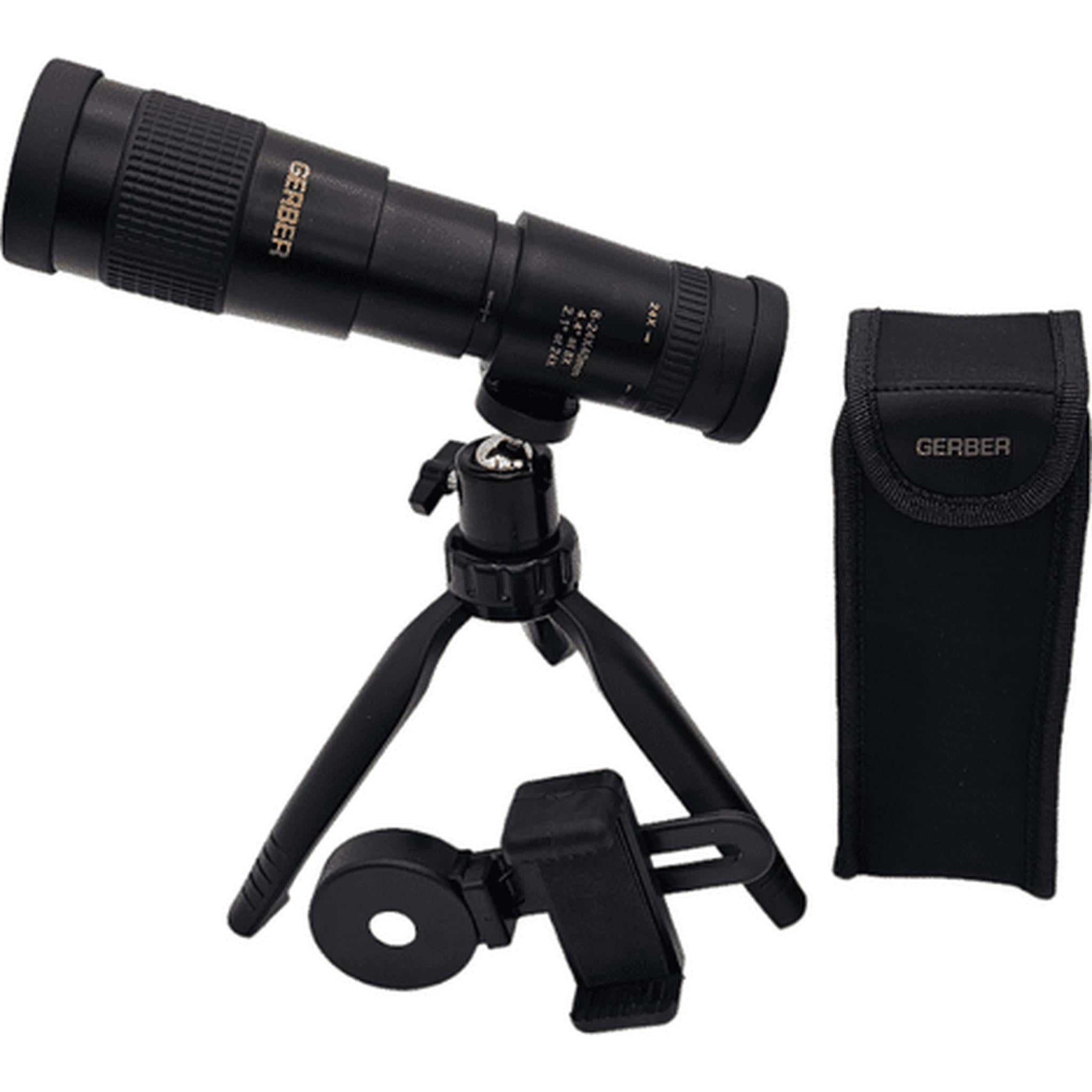 The GERBER Zoom Monucular is extremely versatile, providing an 8x - 24x zoom magnification with a 40mm objective diameter. They feature a handy dual focusing system with quick focus and fine focus option to get you eye on your target in record time. Multi-Coated optics give you crisp clear images, always. The GERBER Zoom Monocular 8-24x40 include a smartphone adapter and handy ball head mini tripod to take amazing images. They are supplied with a soft case, wrist strap (attached at tripod mount), eye piece covers, smartphone adapter and mini ball head tripod, all in a stylish coloured package Type: Zoom Magnification/Diameter: 8x-24x40 Focusing: from 1.6m Field of View: Angle: 4.4° (8x) - 2.1° (24x) at 1000m: 77m (8x) - 37m (24x) at 1000yd.: 230ft. (8x) - 110ft. (24x) Exit Pupil: 5mm (8x) - 1.7mm (24x) Weight: 242g Tripod Adaptability: Yes Gerber Monoculars are made with an uncompromising commitment to quality. Their superior components ensure the ultimate viewing experience for every user. Featuring a wide assortment of models with distinctive specifications. Gerber monoculars have become the favourite choice of avid hunters, birdwatches and boating enthusiasts.