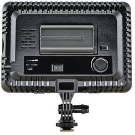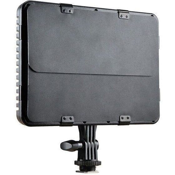 It features the latest LED-driven technology, and angle design barndoor reflectors to enlarge the illumination range and strengthen the brightness. The light is flicker-free, easy to use and reliable. It has a rotating knob to adjust brightness. The colour temperature is 5500K, but changeable with the included filters. The light uses a Sony NP-F series battery (not included) as a power source, and has a battery capacity indicator.