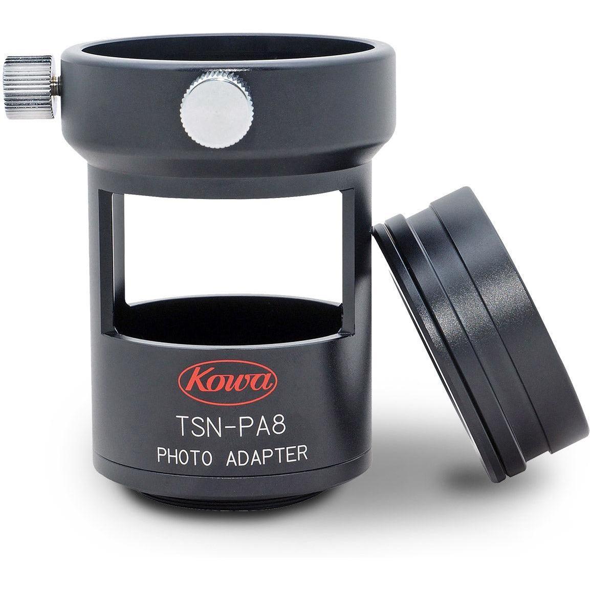 Kowa's TSN-PA8 Digiscoping Adapter installs quickly and easily on your TSN-series spotting scope without tools or having to permanently modify your scope in any way. The main piece of the adapter attaches to the DSLR lens mount using a user-supplied camera-specific T-ring* (*Required, Not Included) which then slides over the installed scope eyepiece. It is designed to place the camera sensor at the eyepiece's optimum eye relief to allow you to achieve crisp, tack-sharp focus using the scope's focus wheel. The adapter is configured with an open-frame to give you full access to the eyepiece zoom collar, so you can enjoy the full power of the eyepiece for you photos. Since the eyepiece stays on the scope while your digiscoping, simply remove the main adapter body to view the scene with your eye.