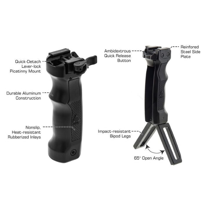 Innovative ambi retractable bipod legs set this grip above the rest. With the simple push of a button your grip turns into a stable 8.4" shooting bipod. Constructed of heavy duty aluminum with a hard coat anodized finish this ergonomic, contoured grip features finger grooves, textured bipod feet, and a quick detachable mounting base that fits on most picatinny or weaver rails.