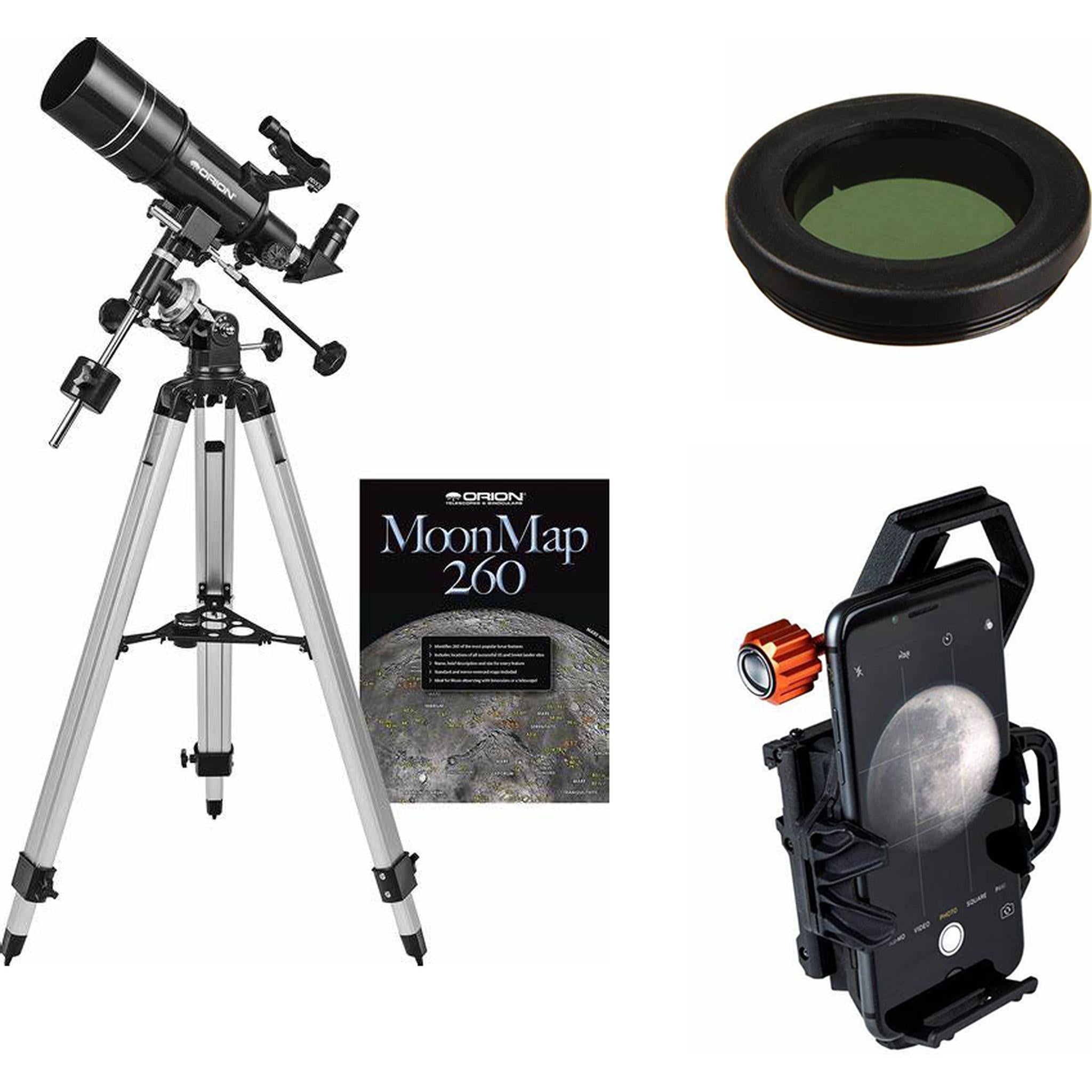 Includes 90-degree star diagonal, two anti-reflection coated 1.25" Kellner telescope eyepieces, red-dot reflex sight and the Orion MoonMap 260