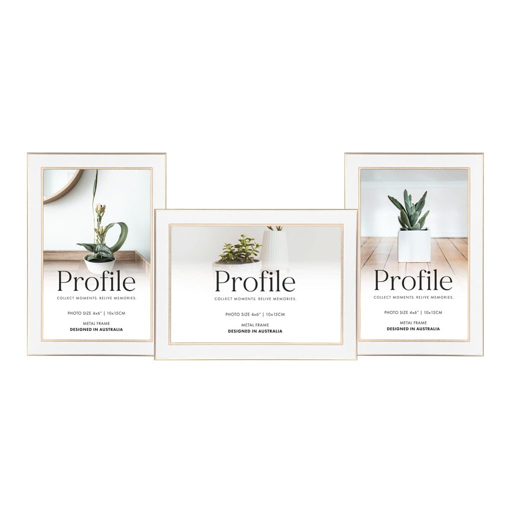 Each Eternalmetal photo framein this fixed multi collage format features a matt white finish on the front face, adorned with a polished rose gold-plated trim along the inside and outside edge of the frame.