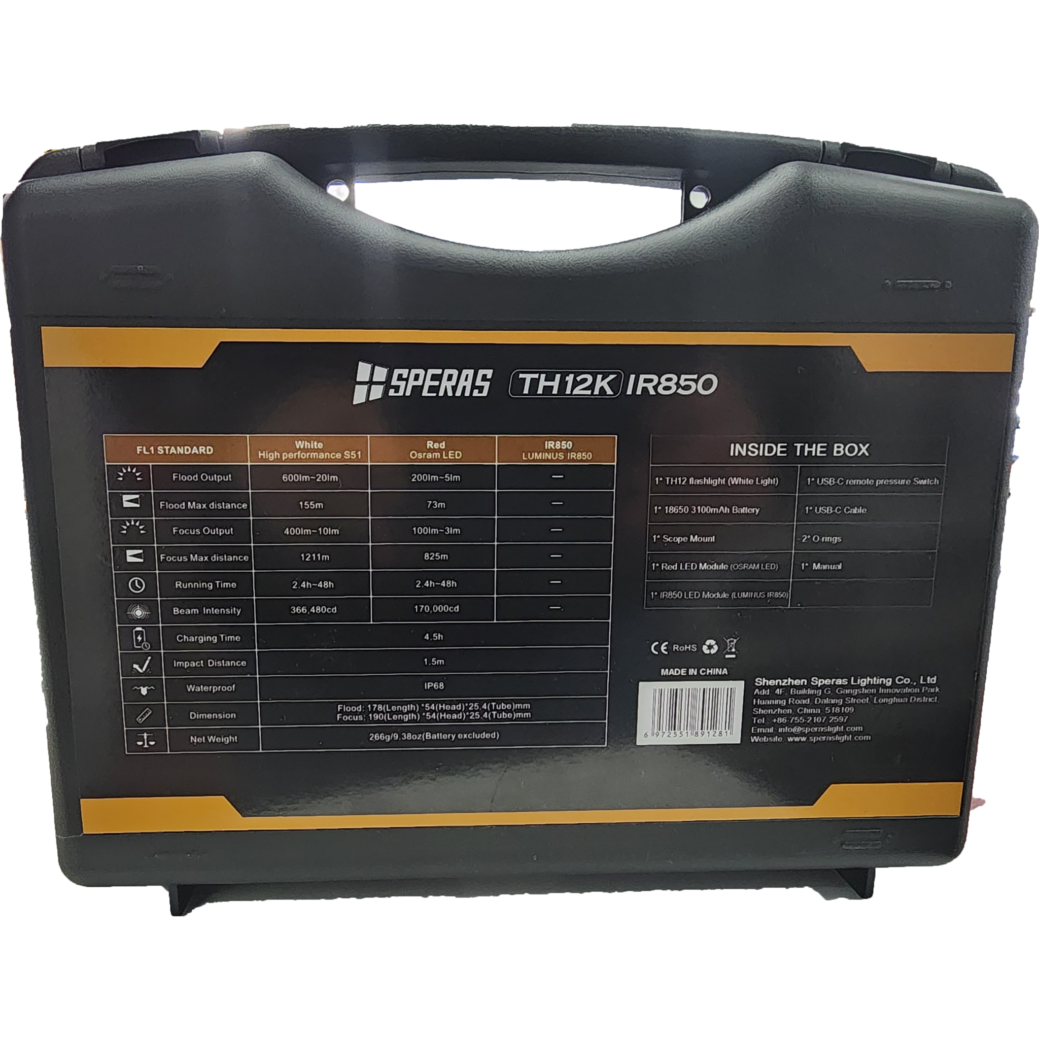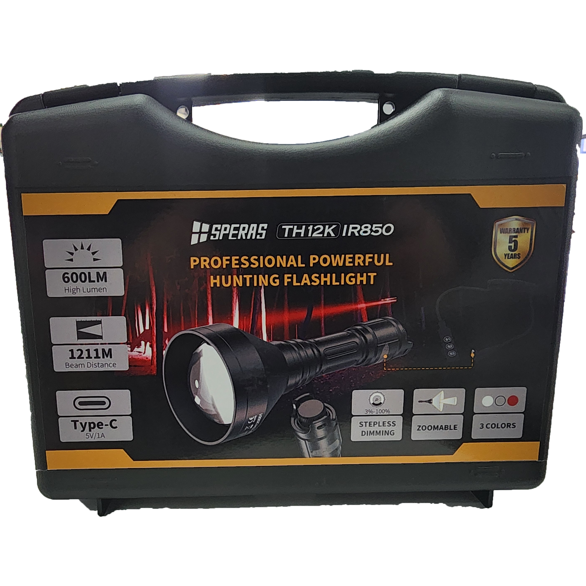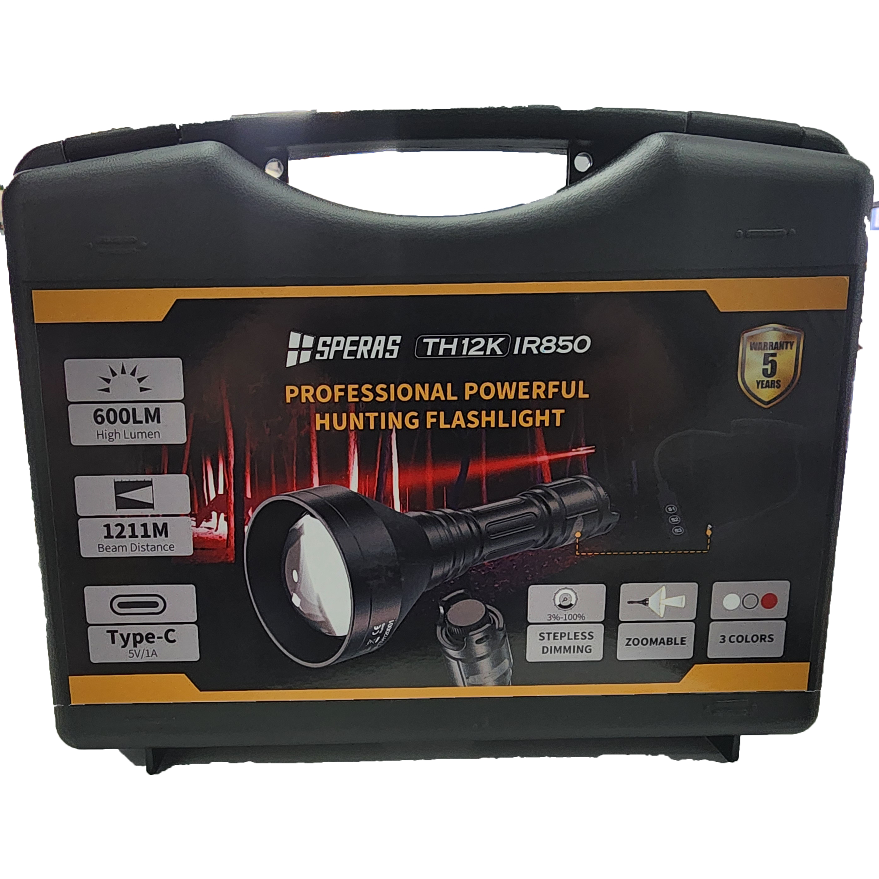 The SPERAS TH12K IR850 Zoomable Flashlight is one of the best professional and powerful hunting lights on the market. Equipped with a 66mm optical lens, advanced structural design, innovative driver technology, and high-performance LEDs, this flashlight is built to meet the demanding needs of hunters, search and rescue teams, and other outdoor enthusiasts. The TH12K offers a versatile lighting solution with its adjustable focus, allowing users to switch between a flood beam and a spot beam, providing the right illumination for any situation.
